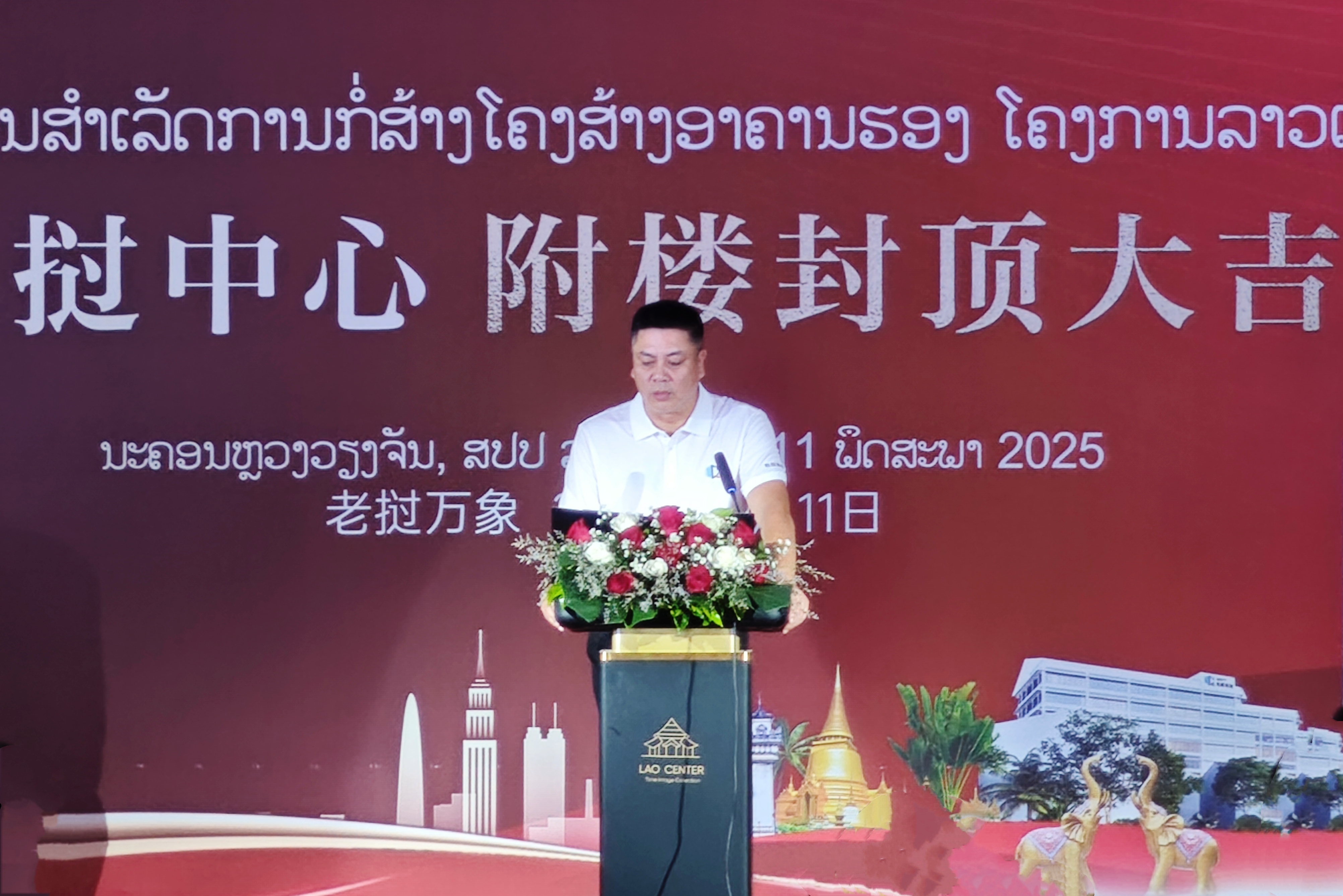 洪高明上臺致辭,向長期以來關(guān)心支持項目建設(shè)的老撾政府、社會各界以及全體建設(shè)者的辛苦付出表示衷心感謝。他指出,附樓的順利封頂,是項目建設(shè)歷程中的一個重要里程碑。老撾中心項目自開工建設(shè)以來,始終秉持高標(biāo)準(zhǔn)、高質(zhì)量的建設(shè)理念,克服了諸多困難與挑戰(zhàn),建成后將成為老撾城市新地標(biāo)之一,將進(jìn)一步促進(jìn)中老兩國在相關(guān)領(lǐng)域的合作與交流。
