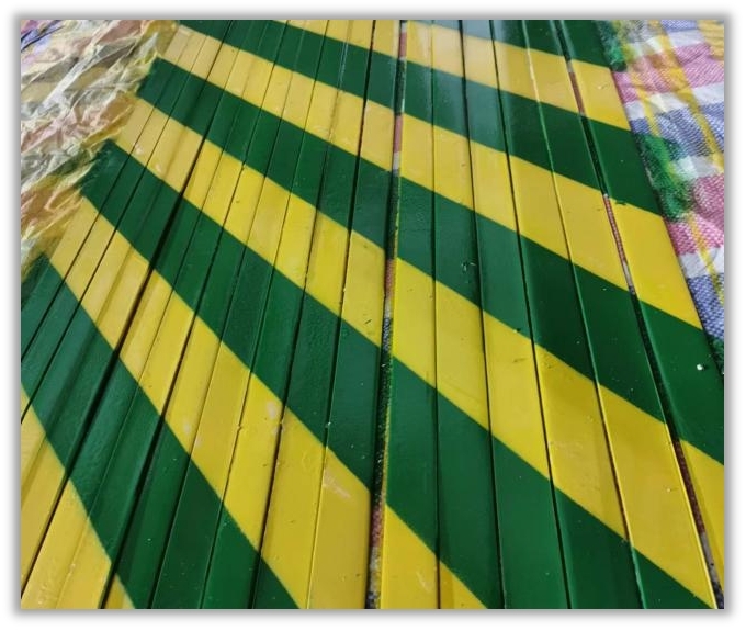 本工程地下室包括106臺風機機組,為提高接地扁鋼整體觀感,項目部自主研制接地扁鐵色標加工噴涂模具,采用30*3角鋼焊制成45°(135°)500mm*600mm的菱形邊框(可根據(jù)實際需求調整大?。?,在邊框兩側焊上提耳和腳踏板,然后在框內每隔100mm設置一道寬100mm分隔板,最后在磨具底部接觸面安裝一層橡膠或其他柔性材料,防止噴涂油漆時因磨具與扁鐵接觸面不緊密導致串色、分隔線條模糊。