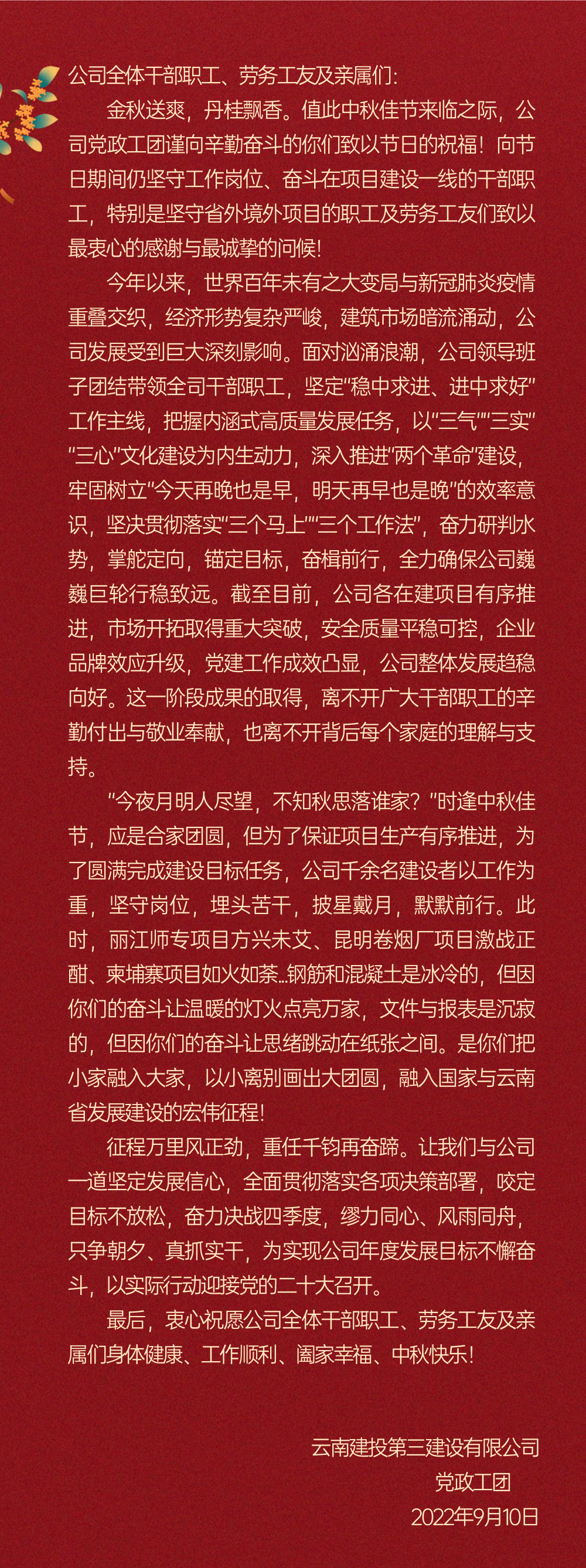 致公司全體干部職工、勞務(wù)工友及親屬們的慰問信