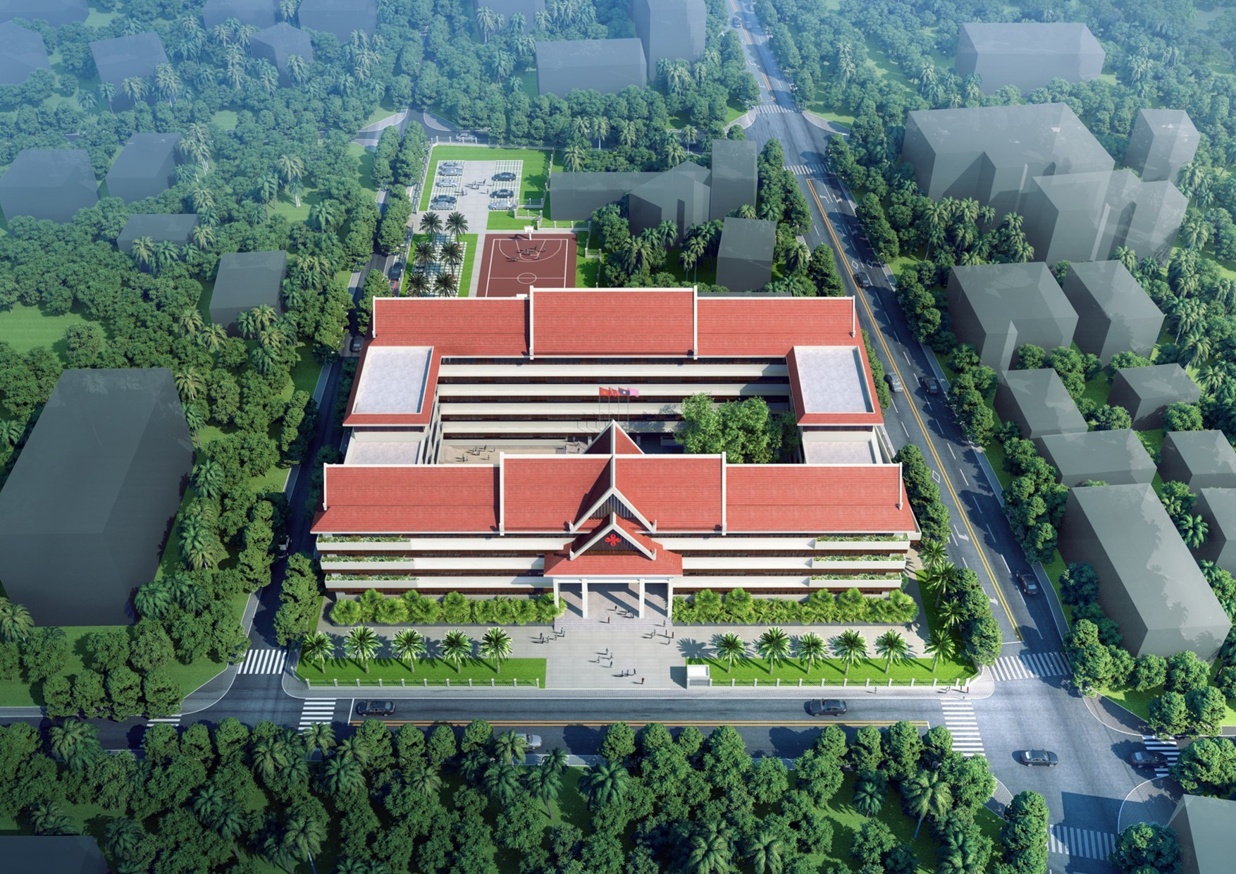 北緯18°、東經(jīng)102°,位于老撾萬象市的援老撾萬象市皮瓦中學(xué)項(xiàng)目工地上,國(guó)際工程部正熱火朝天地進(jìn)行斜屋面瓦施工。