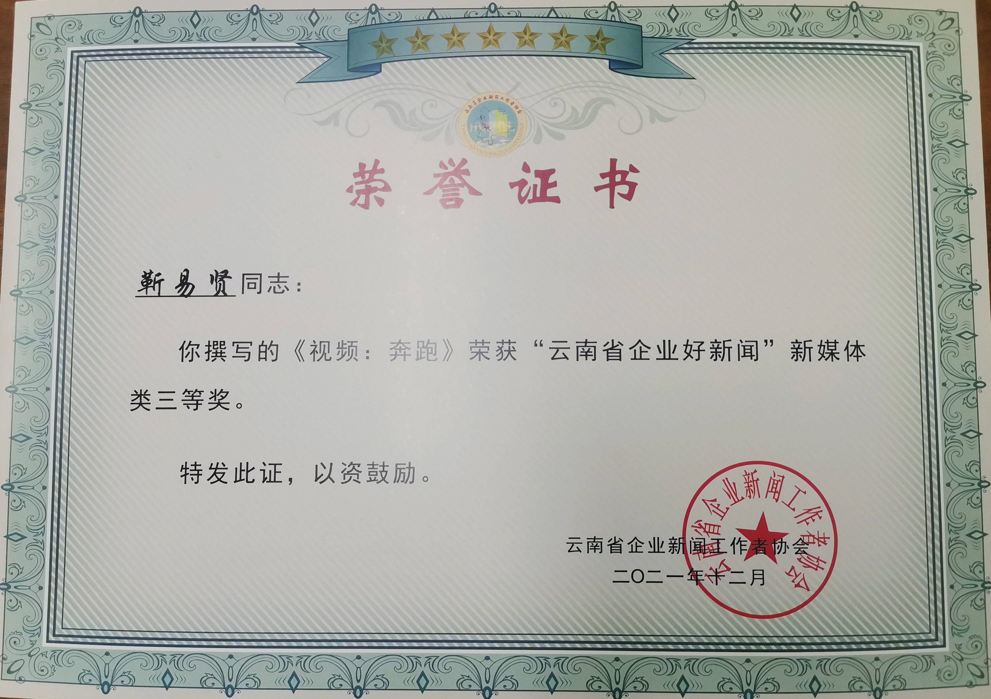 近日,云南省企業(yè)新聞工作者協(xié)會公布“2020-2021年度好新聞”評選結(jié)果,公司4名職工獲獎。其中,第三直管部黨支部書記李梟獲新媒體類二等獎,公司女工主任、第三項目部工會主席靳易賢獲新媒體類三等獎,黨委工作部職工謝超群、邵珊分別獲評論(言論)類、通訊類三等獎。