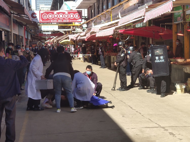 下午2點演練正式開始。一名“歹徒”持刀在1道A棟A-3海鮮水產店門口砍傷一名商戶,值班保安迅速趕到案發(fā)現場處理并上報市場當班領導,為遏制事態(tài)的進一步發(fā)展,市場隨即啟動反恐應急預案。安保人員拿起電警棍進行阻攔,并與歹徒周旋、勸告;其他工作人員在第一時間做好了游客疏散工作,并迅速形成一支強有力的反恐力量,安保人員用鋼叉叉住嫌疑人的腰部、腿部,迅速將其控制,利用盾牌、甩棍等防暴器械默契配合,成功將該男子制伏,有效避免了市場后續(xù)人員傷亡事件的發(fā)生。隨后救護組接到通知趕往現場迅速開展急救處理,整個演練過程緊張有序,疏散和救援有條不紊。