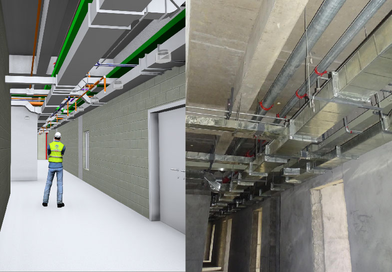 就在大家要松一口氣時(shí),又一道難題橫杠在所有人面前,因?yàn)閷?shí)際進(jìn)場的消防蝶閥、風(fēng)管防火閥與BIM模型中的閥門族尺寸參數(shù)相差太大,按照模型安裝,管道與閥門一定會(huì)發(fā)生沖突碰撞,模型必須依照閥門尺寸重新調(diào)整,才能保證后期的安裝質(zhì)量及精度!為此,項(xiàng)目技術(shù)負(fù)責(zé)人施永祥積極與材料供應(yīng)商對接,了解到各個(gè)部位閥門、設(shè)備的精確尺寸,為BIM模型提供了精準(zhǔn)的參數(shù)。就這樣,張猛拿著數(shù)據(jù),抬抬自己的眼鏡對著電腦又開始干了起來,在對現(xiàn)場建筑結(jié)構(gòu)尺寸、作業(yè)條件反復(fù)校核,對BIM模型無數(shù)次碰撞檢查、調(diào)整沖突后,實(shí)施方案終于定稿。最終實(shí)施效果較好,管道安裝成排成列,支吊架安裝均勻牢靠。