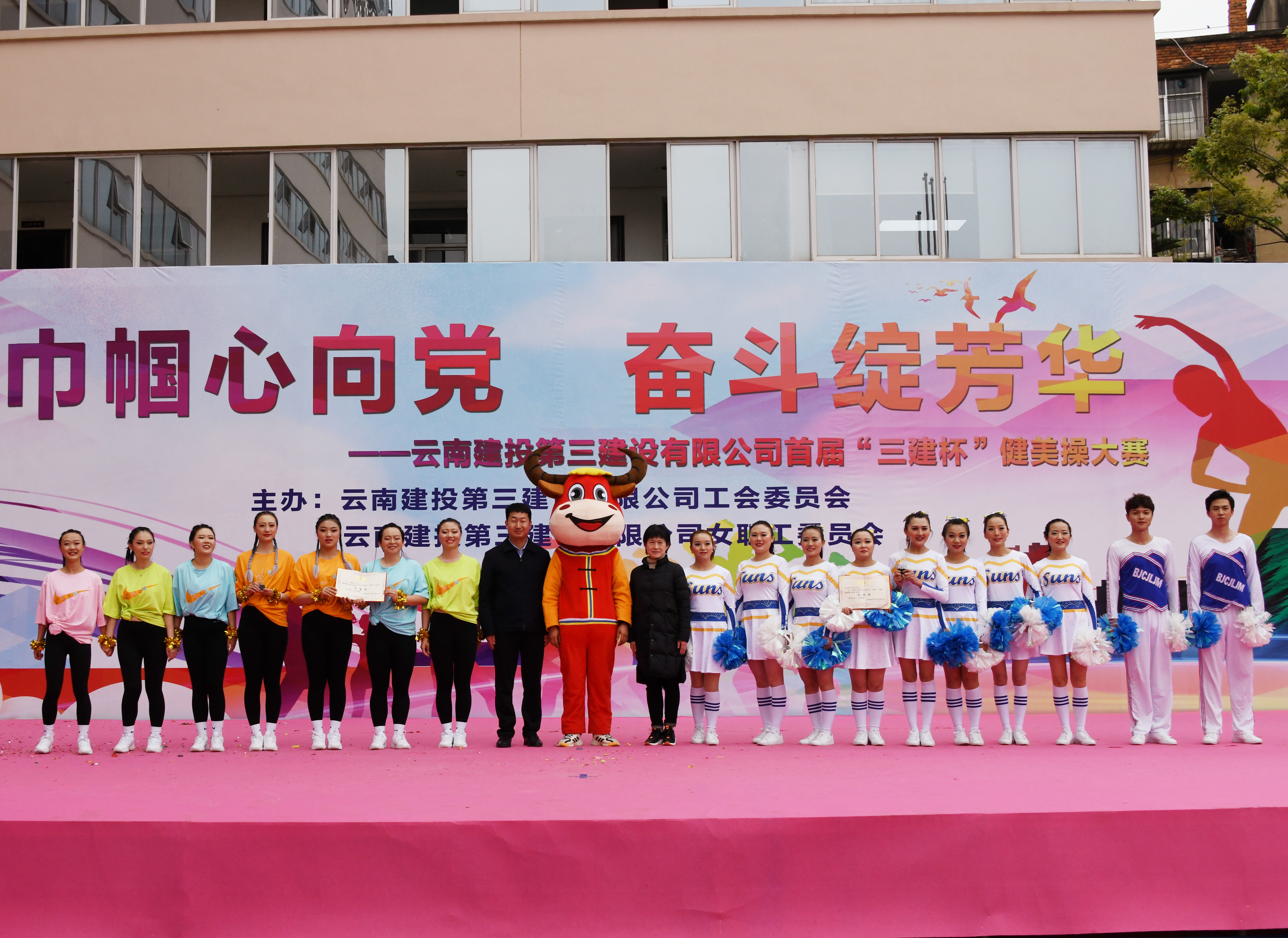 各支參賽隊(duì)在賽場上英姿颯爽、動感張揚(yáng)。這邊第一項(xiàng)目經(jīng)理部代表隊(duì)國風(fēng)熱舞,展現(xiàn)傳統(tǒng)魅力與現(xiàn)代健美的融匯、碰撞;那邊周轉(zhuǎn)材料租賃中心代表隊(duì)老少齊上陣天天向上,展現(xiàn)三建人團(tuán)結(jié)奮發(fā)、積極拼搏精神。看第十五直管項(xiàng)目部、安裝分公司聯(lián)隊(duì)意氣風(fēng)發(fā),放飛夢想。看第六直管項(xiàng)目部、路橋市政二部聯(lián)隊(duì)笑容燦爛、光華耀眼。第二直管項(xiàng)目部代表隊(duì)的身手矯健、動作整齊、舞姿勁霸。第一、第五直管項(xiàng)目部聯(lián)隊(duì)以奮發(fā)之姿、拼搏之態(tài),演繹青春之夢,迎接未來挑戰(zhàn)。第一水電項(xiàng)目部代表隊(duì)意氣風(fēng)發(fā),積極進(jìn)取。第二、第四項(xiàng)目經(jīng)理部聯(lián)隊(duì)快樂奔放、舞動全場。機(jī)關(guān)代表隊(duì)時(shí)尚靚麗、朝氣勃勃……十五支參賽隊(duì)配著動感的音樂、踏著快樂的節(jié)拍、全力以赴、激情演繹,用活力四射的健身操,綻放青春光彩,激蕩奮進(jìn)力量。臺下掌聲雷動,歡呼聲,口哨聲,歡聲笑語。加油聲、助威聲,熱情高漲。