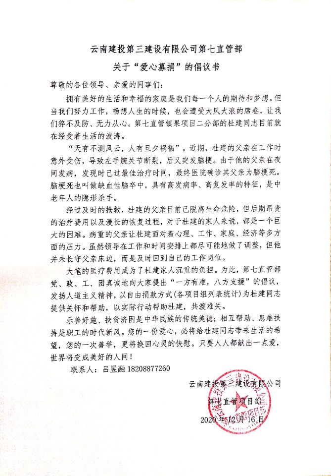 一方有難,八方支援。近日,第七直管項(xiàng)目部組織開展“獻(xiàn)愛心捐款”活動(dòng),為項(xiàng)目職工杜建同志父親捐款25410元,幫助他們度過眼前難關(guān),祝愿杜建父親盡快戰(zhàn)勝病魔、早日康復(fù)。