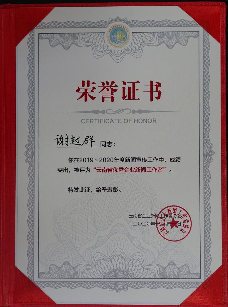 12月9日—11日,在玉溪市召開的“云南省企業(yè)新聞工作者協(xié)會2020年會暨紅塔文化講壇”中,公司微信公眾號“云南建投第三建設(shè)有限公司”榮獲“云南省優(yōu)秀企業(yè)新媒體”榮譽稱號,謝超群榮獲“2019-2020年度云南省優(yōu)秀企業(yè)新聞工作者”榮譽稱號。